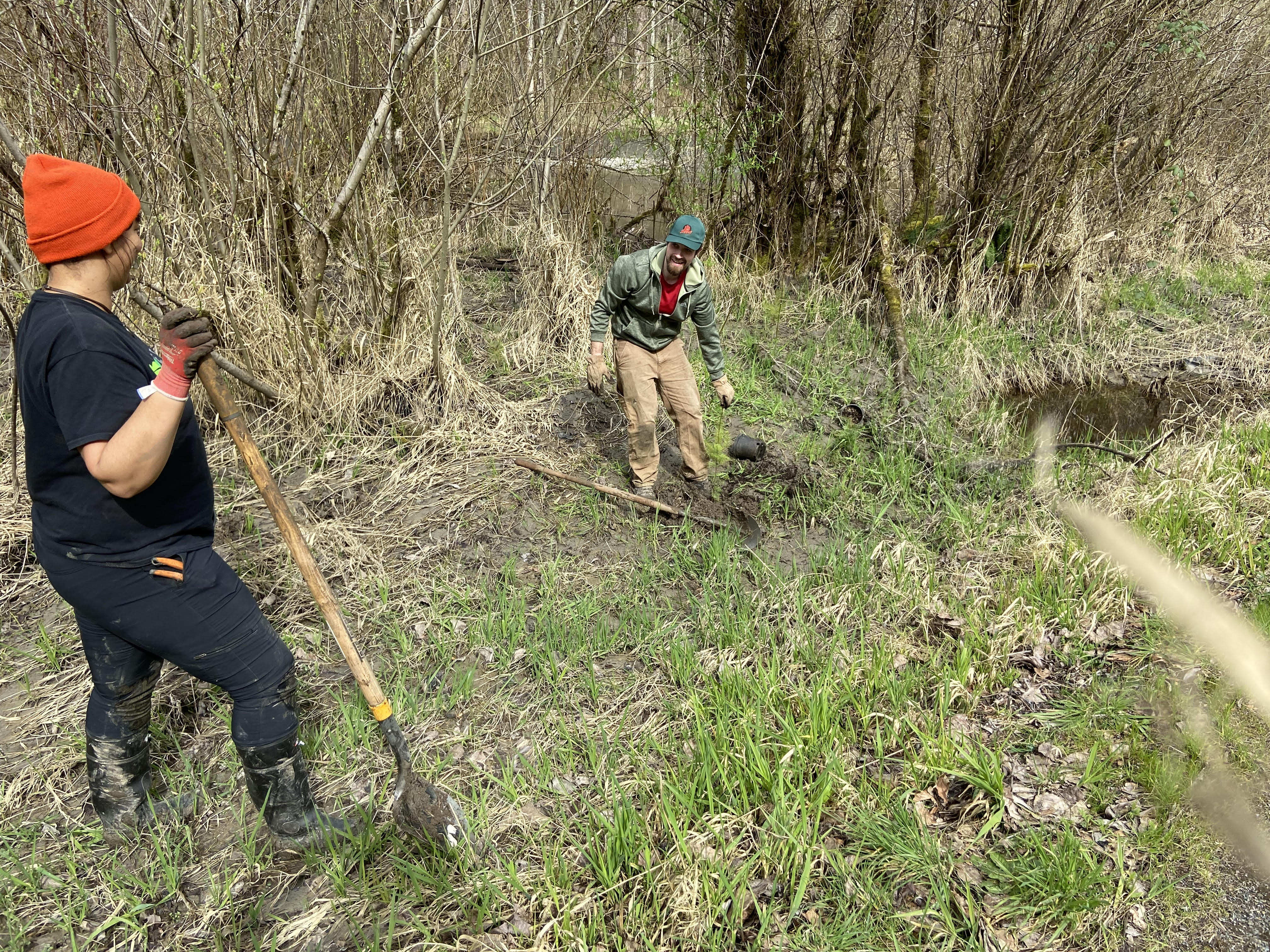 In December 2021, Nicoterra was contacted by a long standing client: Green River Coalition about needed restoration plantings on Big Soos Creek. King County Council – Pete Von Reichbauer directed funds for a concentrated four-season shade tree planting plan on the southernside of the creek bank up to the roadway corridor. One of the reasons, Nicoterra was chosen for this effort was based on various levels of vandalism in the 500′ long site: a former home was in the process of being removed and repurposed to a native status, but the land vacancy created a vacuum for misuse, needle use, and trash. The other reason had to do with careful plantings needed within a dense broadleaf tree canopy. In March and April of 2022, the over 200 mixed conifer seedlings were planted in the midst of mulching assistance from King County Natural Resources, and other site preparations in collaboration with Green River College Student Interns. Nicoterra is grateful for all the excellent work by field crew and student interns along with coordination from Brian Lund, King County DNRP, Michael Taton, GreenRiver Coalition and many others. In 2023, a further conifer planting will be brought to this riparian forest to infill and supplement any losses from the first planting based on a conifer census. This site is immediately upstream from a State Fish Hatchery.